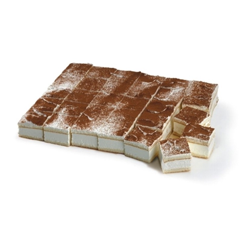 Plancha precortada en 30 raciones de un clásico en entre los postres, el Tiramisú.