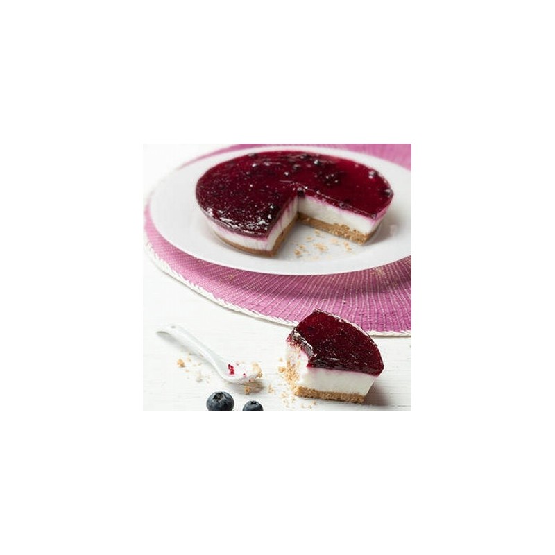 Deliciosa crema de queso fresco sobre una crujiente base de galleta recubierta con mermelada de arándanos.