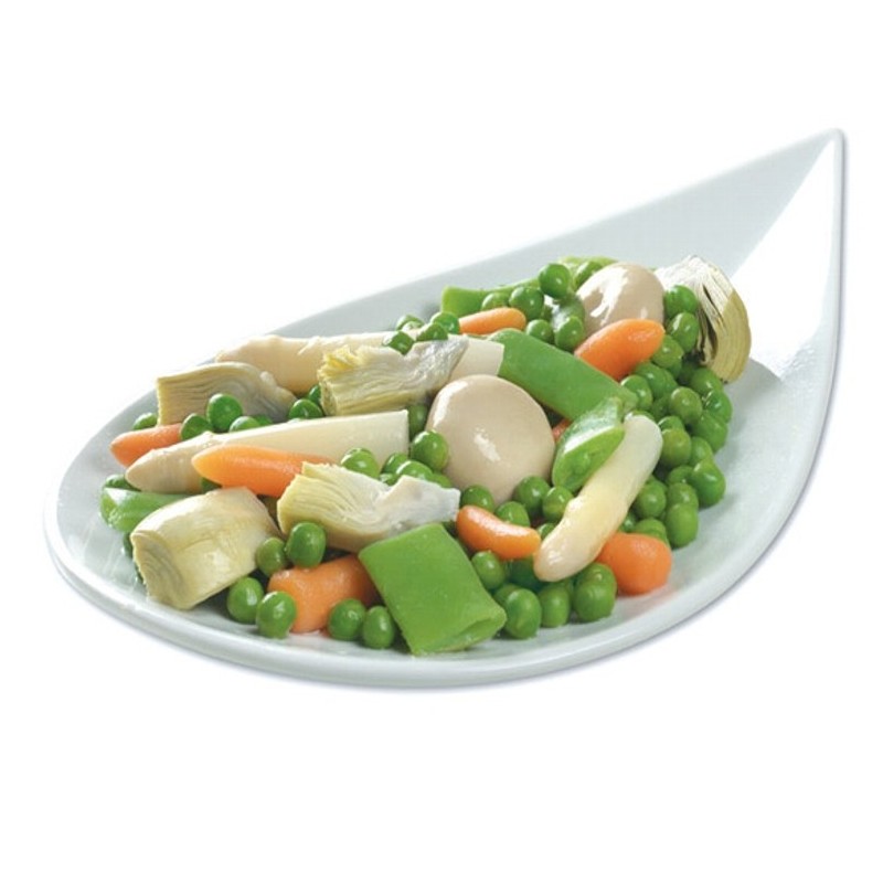 Yemas de espárrago blanco, alcachofa trozos, judia verde, guisante, champiñón entero y zanahoria rodajas.